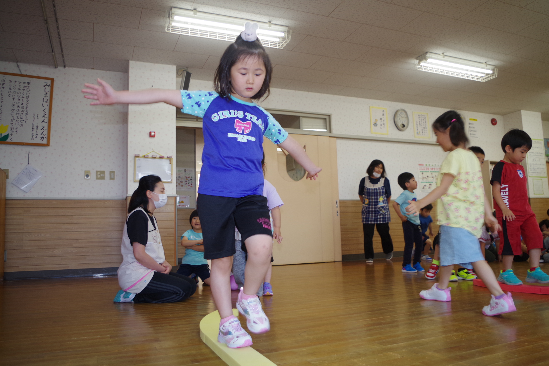 ボールやフラフープ、平均台を使い、楽しく遊びながらバランス感覚を養ったり、頭で考えて体を動かす等といったコーディネーション運動が中心です。